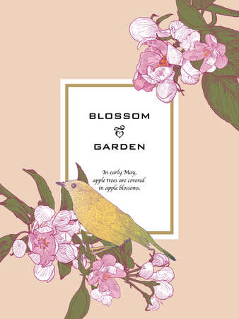 ビンテージ花グリーティング カード咲くりんごの木 カラフルなイラスト 手描き植物スタイルです のイラスト素材 ベクタ Image